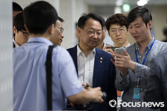 (서울=포커스뉴스) 유일호 경제부총리 겸 기획재정부 장관이 15일 오전 서울 종로구 서울창조경제혁신센터 부속 인큐베이팅 센터에서 입주기업을 둘러보고 있다.