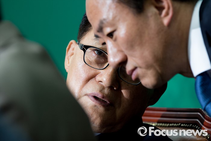(서울=포커스뉴스) 박지원 국민의당 원내대표와 김명진 원내대표비서실장이 15일 오전 서울 여의도 국회에서 열린 최고위원회의에 참석해 대화를 나누고 있다.