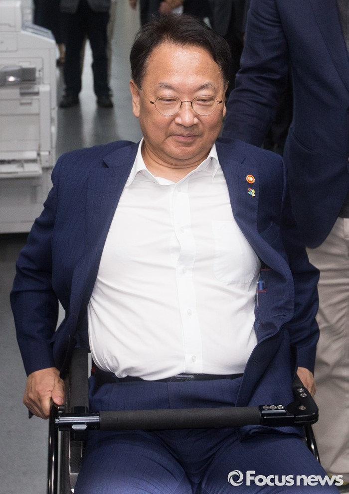 (서울=포커스뉴스) 유일호 경제부총리 겸 기획재정부 장관이 15일 오전 서울 종로구 서울창조경제혁신센터 부속 인큐베이팅 센터에서 입주기업을 둘러보던 중 낙상 방지 휠체어 체험을 하고 있다.