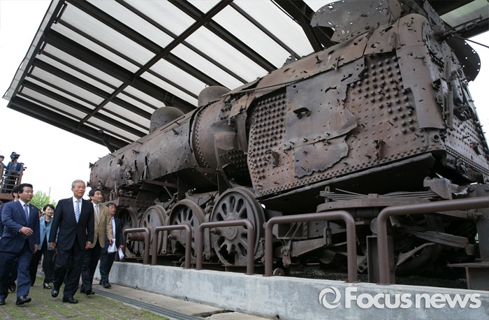 (파주=포커스뉴스) 15일 오전 경기도 파주 임진각 통일전망대에서 더불어민주당 비상대책위원회의를 마친 김종인 비대위 대표와 의원들이 전시된 경의선 장단역 증기기관차를 둘러보고 있다.