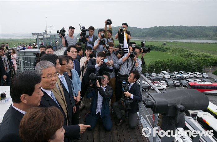 (파주=포커스뉴스) 15일 오전 경기도 파주 임진각 통일전망대에서 더불어민주당 비상대책위원회의를 마친 김종인 비대위 대표와 의원들이 임진각 철교 주변을 바라보고 있다.