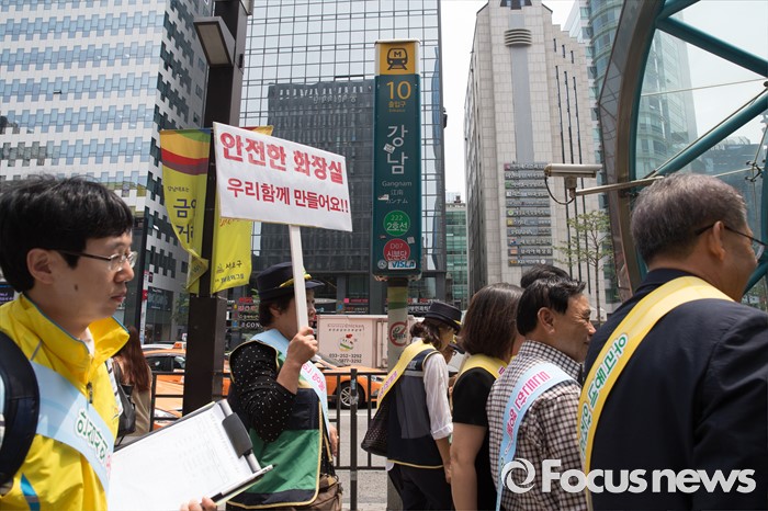 (서울=포커스뉴스) 15일 오전 서울 강남구 강남역인근에서 안전문화운동 실천협의회, 여성 민방대원들이 여성 안전 대책을 촉구하며 캠페인을 벌이고 있다.