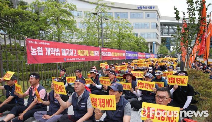 (세종=포커스뉴스) NH농협중앙회노동조합 구성원들이 15일 오전 세종시 정부세종청사 농림축산식품부 앞에서 농협법 개정안 반대 투쟁 선포식을 열고 농협법 개정반대를 촉구하고 있다.