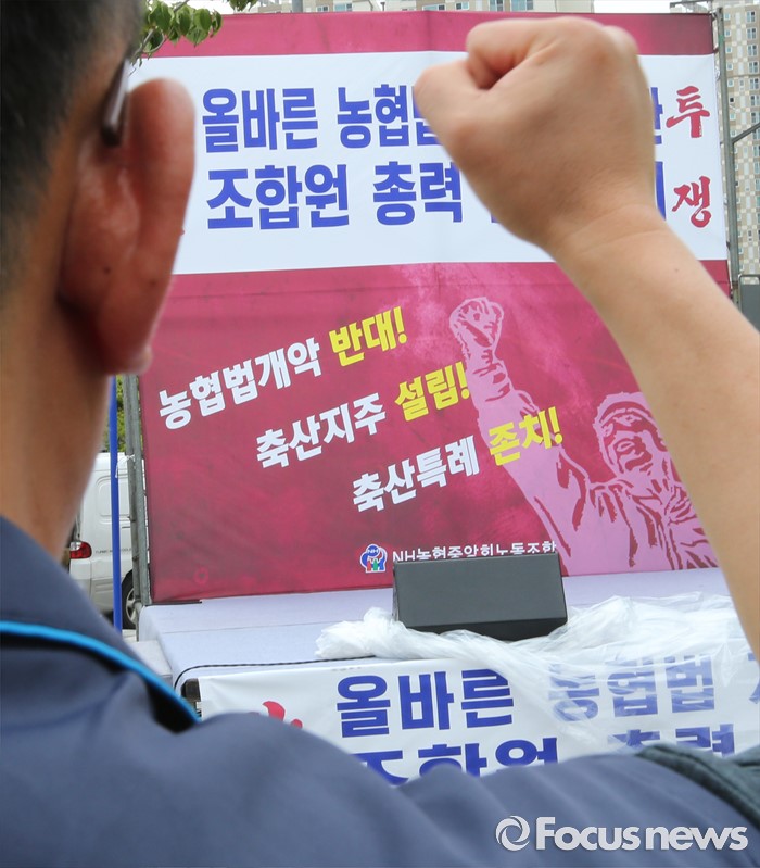 (세종=포커스뉴스) NH농협중앙회노동조합 구성원들이 15일 오전 세종시 정부세종청사 농림축산식품부 앞에서 농협법 개정안 반대 투쟁 선포식을 열고 농협법 개정반대를 촉구하고 있다.