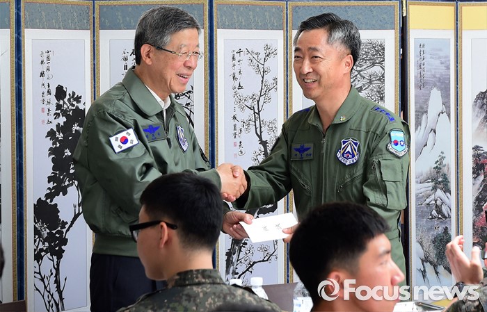 (오산=포커스뉴스) 김희옥(왼쪽) 새누리당 혁신비상대책위원장이 15일 오후 경기도 오산 공군작전사령부를 방문해 장병들과 함께 오찬을 가진 뒤 이왕근 공군 작전사령관에게 격려금을 전달하고 있다.