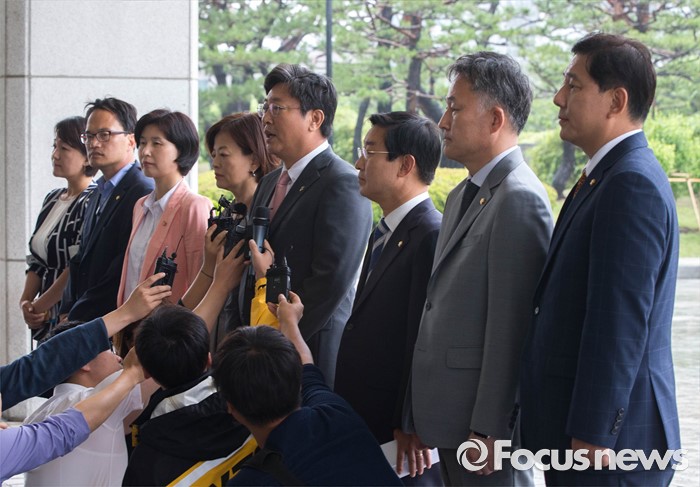 (서울=포커스뉴스) 더불어민주당 '어버이연합 등 불법자금지원 의혹 규명 진상조사 특별팀 (TF)' 소속 이춘석 의원이 15일 오후 서울 서초동 대검찰청 앞에서 TF팀의 항의방문 목적을 설명하고 있다. 왼쪽부터 더불어민주당 이재정, 박주민, 백혜련, 진선미, 이춘석, 박범계, 표창원, 김병기 의원.