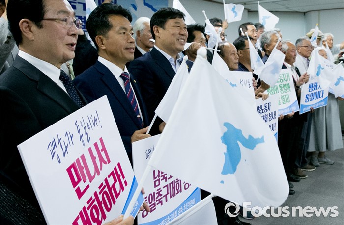 (서울=포커스뉴스) 15일 오후 서울 여의도 국회도서관에서 남북노동자통일축구대회 공동추진위원회 결성식를 마친 김동만 한국노총 위원장, 최종진 민주노총 위원장 직무대행 등 남측 추진위원회 참석자들이 한반도기를 흔들며 취재진을 향해 포즈를 취하고 있다.