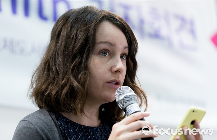 (서울=포커스뉴스) 15일 오후 서울 강남구 코엑스에서 열린 2016 서울국제도서전에서 '채식주의자'의 번역가인 데보라 스미스가 기자회견을 하고 있다.