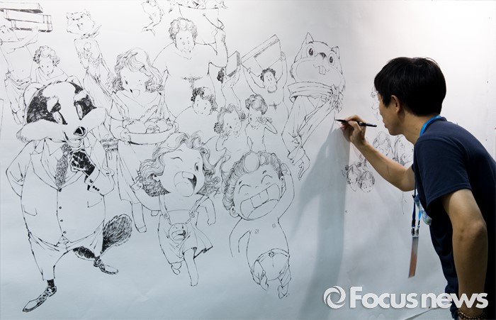 (서울=포커스뉴스) 15일 오후 서울 강남구 코엑스에서 열린 2016 서울국제도서전에서 김홍선 만화가가 그림을 그리고 있다.