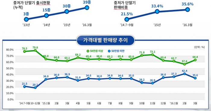 정부가 단통법의 주요 성과로 내세운 중저가 단말기의 보급도 맥이 끊길 전망이다. 방통위와 미래창조과학부는 그동안 단통법의 효과 중 하나로 중저가 단말기 판매가 호조세를 홍보했다. 미래부에 따르면 중저가 단말기는 2013년 3종에 불과했지만 2016년 3월까지 총 39종이 출시됐다. 중저가 단말기 판매비중은 2014년 21.5%에서 2016년 3월 35.6%까지 올랐다. 미래부 관계자는 “중저가 단말기가 많이 출시되면서 소비자 선택권이 넓어졌고 소비자들의 합리적인 소비에도 기여했다”고 말했었다.