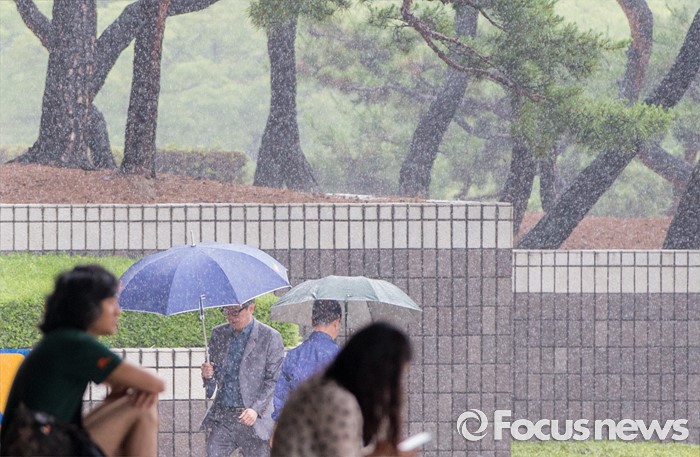 (서울=포커스뉴스) 전국적으로 많은 비가 내린 15일 오후 서울중앙지방검찰청에서 우산을 쓴 시민들이 발걸음을 재촉하고 있다. 기상청은 이번주 일요일부터 본격적인 장마가 시작될 것으로 전망했다.