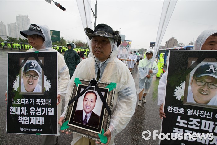 (서울=포커스뉴스) 15일 오후 유성기업 노동자 故 한광호씨의 분향소를 양재동 현대차 본사 앞으로 옮기는 꽃길 100리 행진에 참여한 노동자들이 현대차 본사 앞으로 들어오고 있다.