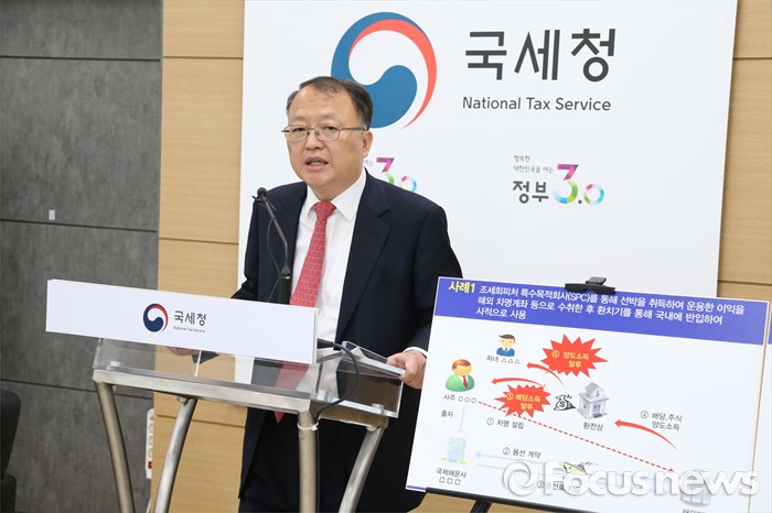 (세종=포커스뉴스) 한상영 국세청 조사국장이 15일 오전 정부세종 2청사 국세청 기자실에서 지난 3월 역외소득·재산 자진신고 기간이 종료함에 따라 소득이나 재산을 해외에 은닉하고도 자진신고에 응하지 않은 역외탈세 혐의자 36명에 대해 세무조사를 착수했다고 밝히고 있다. <사진제공=국세청>