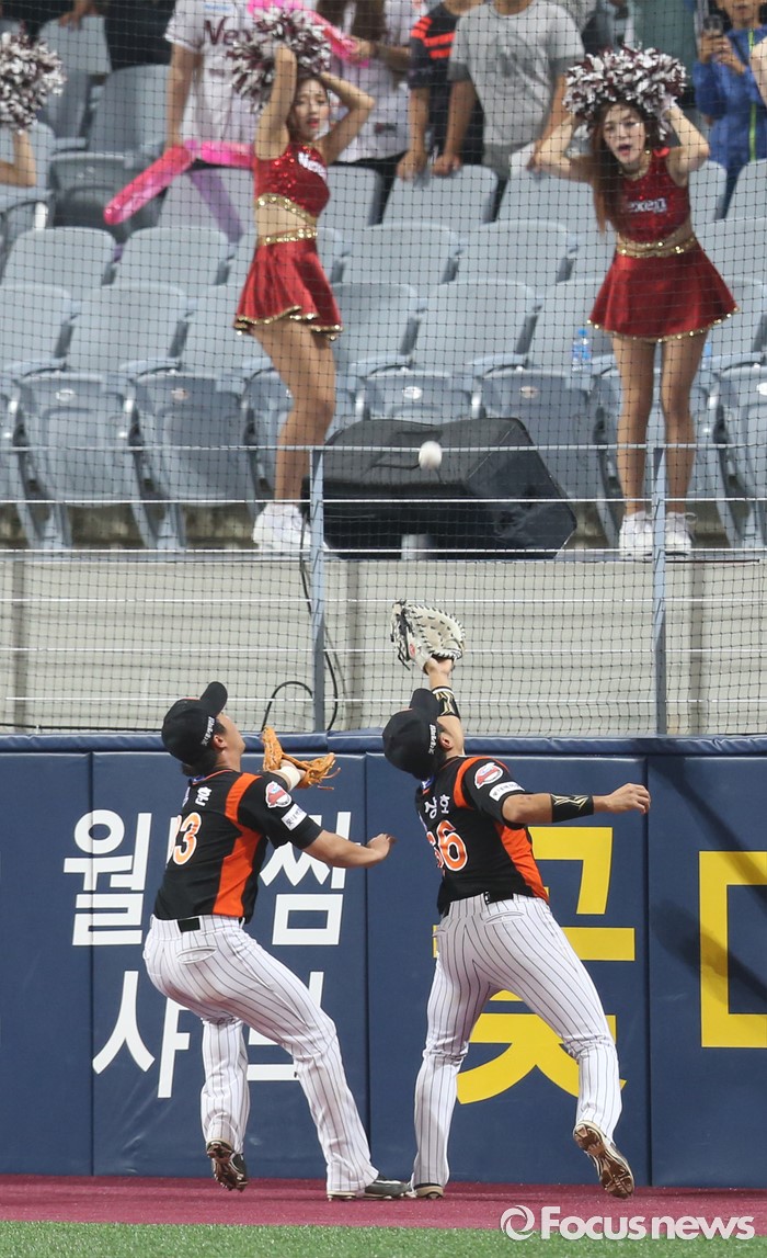 (서울=포커스뉴스) 15일 서울 고척 스카이돔 구장에서 열린 2016 프로야구 롯데-넥센 경기 3회말 롯데 1루수 김상호와 2루수 정훈이 넥센 박정음의 파울 플라이를 펜스 앞에서 잡으려 하고 있다. 넥센 치어리더의 시선이 애처럽다.