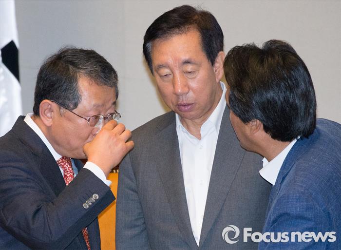 이어 당초 기재위원장급으로 언급됐던 비박계 3선 이종구, 이혜훈 의원에 대해 "흔히 말하는 개성이 뚜렷한, 이런 계파적인 색으로 보면 친박 입장에선 썩 좋은 입장을 가지지 않는다"며 "또 (기재위원장인) 조경태 의원은 4선이다. 선수 예우를 부분에 대해 많은 의원들의 판단이 있었던 것이지 전문성을 배제하고 계파 때문에 그런 것은 아니다"고 강조했다.(서울=포커스뉴스) 18일 오전 서울 여의도 국회 예결위 회의장에서 열린 예산결산특별위원회 전체회의에서 김재경(왼쪽) 위원장, 김성태(가운데) 여당 간사, 안민석 야당 간사가 이야기를 나누고 있다. 2015.08.18 박철중 기자