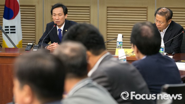 (서울=포커스뉴스) 16일 오전 서울 여의도 국회 의원회관에서 열린 남북경제협력사업 중단에 따른 손실보상에 관한 특별법안 토론회에 참석한 우상호(왼쪽) 더불어민주당 원내대표가 축사를 하고 있다.