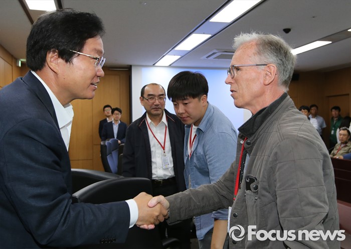 (세종=포커스뉴스) 김영석 해양수산부 장관이 16일 오전 세종시 정부세종청사 해수부 중회의실에서 열린 세월호 공정 점검회의에서 참석해 선박 인양 컨설팅업체인 TMC의 스테판 티어니 사장과 악수하고 있다.