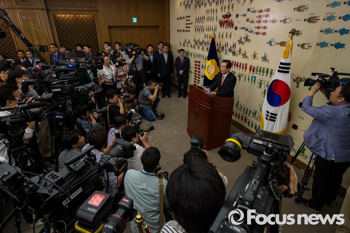 | △ 취재진에 둘러 싸인 정제균 국회의장 |
