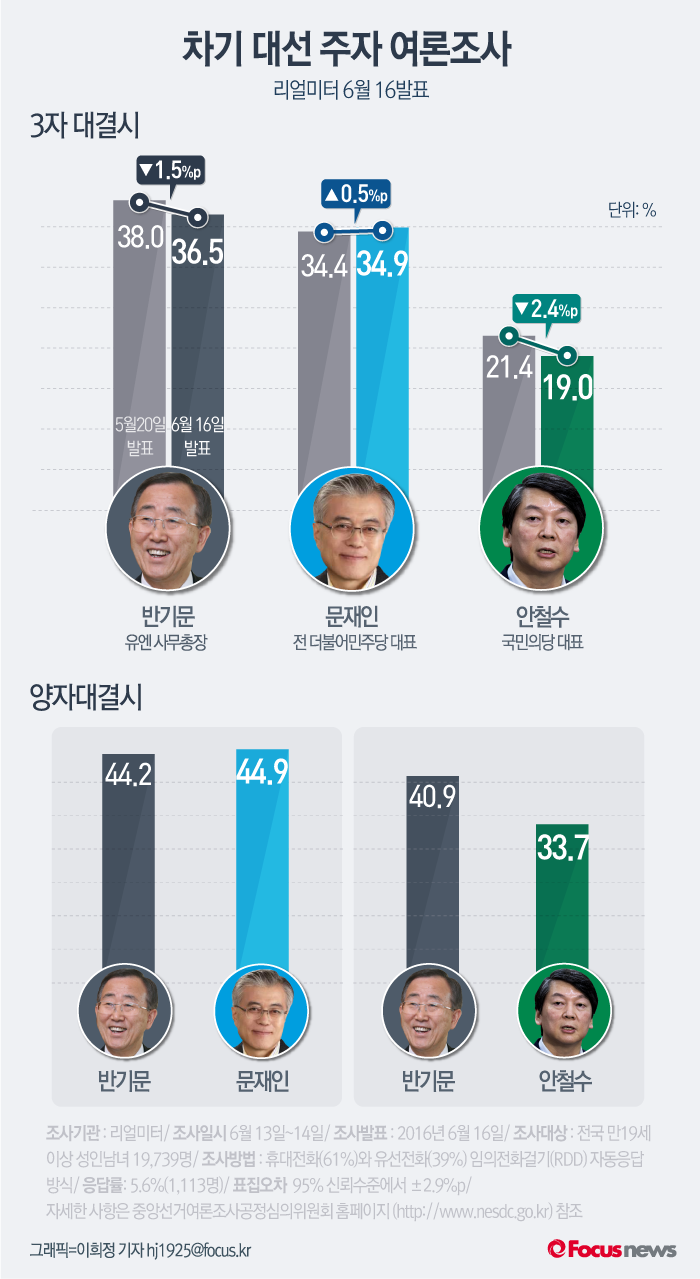 (서울=포커스뉴스) 16일 리얼미터 6월 차기 대선주자 3자대결 발표에 따르면 반기문 유엔사무총장과 문재인 더불어민주당 전 대표가 두 달째 오차범위 내 박빙 접전을 벌이고 있다. 양자대결에서는 문 전 대표와 반 총장이 초방빅 접전을 벌이고 있고, 반 총장과 안 대표의 대결에서는 반 총장이 오차범위 밖에서 우세한 것으로 나타났다.