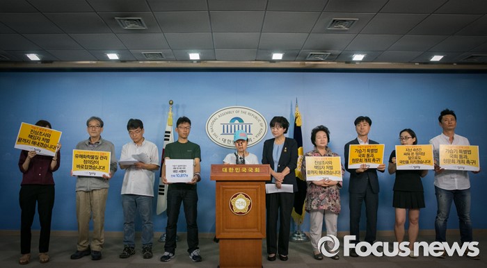 (서울=포커스뉴스) 16일 오전 서울 여의도 국회 정론관에서 이정미 정의당 원내수석부대표, 가습기살균제 피해자와 가족모임이 정세균 국회의장에게 대책마련 대국민 서명지를 전달하기에 앞서 기자회견을 하고 있다.
