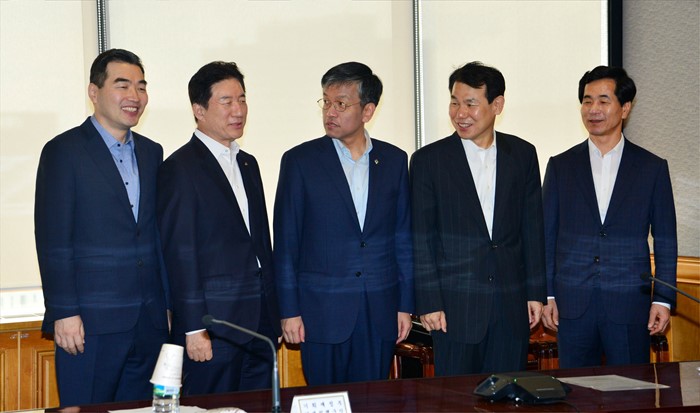(서울=포커스뉴스) 최상목 기획재정부 차관이 6월 16일 서울시 중구 은행회관에서 열린 제38차 거시경제금융회의를 주재, 회의 참석자들과 금일 미 FOMC 회의 결과가 및 국내에 미치는 영향에 관한 논의를 하고 있다. 왼쪽부터 정규돈 국제금융센터 원장, 장병화 한국은행 부총재, 최상목 차관, 정은보 금융위원회 부위원장, 박세춘 금융감독원 부원장. <사진제공=기획재정부>