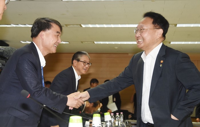 (서울=포커스뉴스) 유일호 부총리 겸 기획재정부 장관이 6월 16일 광화문 서울청사에서 열린 '제11차 공공기관운영위원회'를 주재, 참석위원들과 악수하며 인사를 나누고 있다. <사진제공=기획재정부>