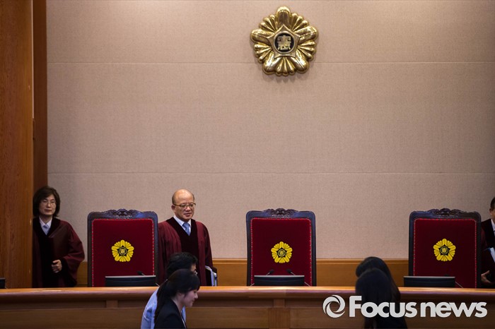 (서울=포커스뉴스) 16일 오후 서울 종로구 헌법재판소 대심판정에서 박한철 헌법재판소장이 공공기관에 개인정보 요구 형사소송법 제199조 제2항 등 헌법소헌의 공개 변론을 위해 대심판정으로 입장하고 있다.