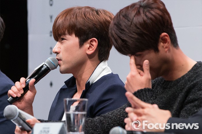 (서울=포커스뉴스) 16일 오후 서울 여의도구 63빌딩 그랜드볼룸에서 열린 보이그룹 오디션 프로그램 '소년24 프로젝트' 제작발표회에 참석한 그룹 신화의 이민우(왼쪽)가 기자들의 질문에 답하고 있다.