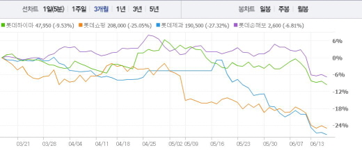 이 외에도 롯데칠성(-1.06%), 롯데제과(-0.78%), 롯데정밀화학(-0.77%), 롯데손해보험(-0.38%), 롯데푸드(-0.36%) 등의 그룹 계열사들이 줄줄이 하락했다.