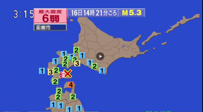 일본 NHK 등 현지 언론은 16일 오후 2시21분께 일본 홋카이도 하코다테에서 심한 흔들림을 동반한 규모 5.3의 강진이 발생했다고 보도했다. 진원 깊이는 10㎞로 관측됐다.