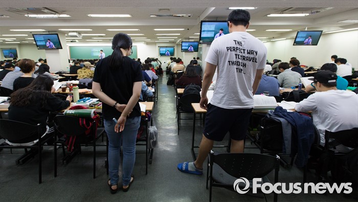 (서울=포커스뉴스) 지방직 9급 공무원 필기시험을 이틀 앞둔 15일 오후 서울 동작구 공단기 노량진학원에서 시험 응시자들이 강의을 듣고 있다.