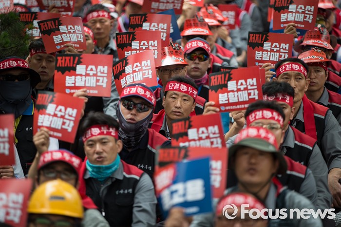 (서울=포커스뉴스) 이틀 전 총파업을 결의한 대우조선해양 노조가 16일 오후 서울 여의도 산업은행 앞에서 사측의 일방적 구조조정에 반대하며 상경투쟁을 벌이고 있다.