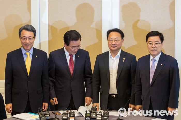 (서울=포커스뉴스) 16일 오후 서울 여의도 국회에서 열린 '2차 민생경제 현안점검회의'에 참석한 3당 정책위의장과 경제부총리가 회의 시작에 앞서 손을 맞잡고 사진촬영 하고 있다. 왼쪽부터 김성식 국민의당 정책위의장, 변재일 더불어민주당 정책위의장, 유일호 경제부총리 겸 기획재정부 장관, 김광림 새누리당 정책위의장.