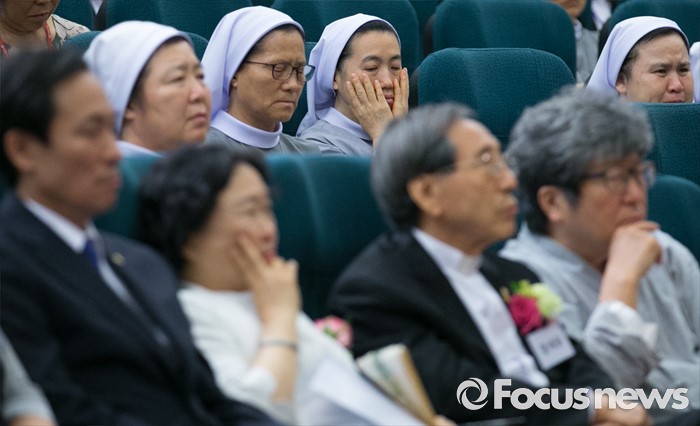 (서울=포커스뉴스) 16일 오후 서울 여의도 국회도서관에서 열린 김근태기념치유센터 개소 3주년 2016 국제 고문피해자 지원의 날 행사에 참석한 수녀들이 고문피해자들의 내러티브 연극 '진실을 외쳐라'를 관람하며 슬픔에 잠겨 있다.