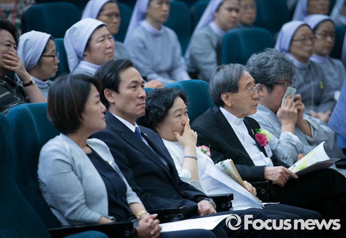 (서울=포커스뉴스) 16일 오후 서울 여의도 국회도서관에서 열린 김근태기념치유센터 개소 3주년 2016 국제 고문피해자 지원의 날 행사에 참석한 이재정(앞줄 왼쪽부터) 더불어민주당 원내대변인, 우상호 원내대표, 인재근 의원, 함세웅 신부 등 참석자들이 고문피해자들의 내러티브 연극 '진실을 외쳐라'를 관람하고 있다.