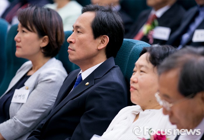 (서울=포커스뉴스) 16일 오후 서울 여의도 국회도서관에서 열린 김근태기념치유센터 개소 3주년 2016 국제 고문피해자 지원의 날 행사에 참석한 이재정(왼쪽부터) 더불어민주당 원내대변인, 우상호 원내대표, 인재근 의원, 함세웅 신부가 고문피해자들의 내러티브 연극 '진실을 외쳐라'를 관람하고 있다.