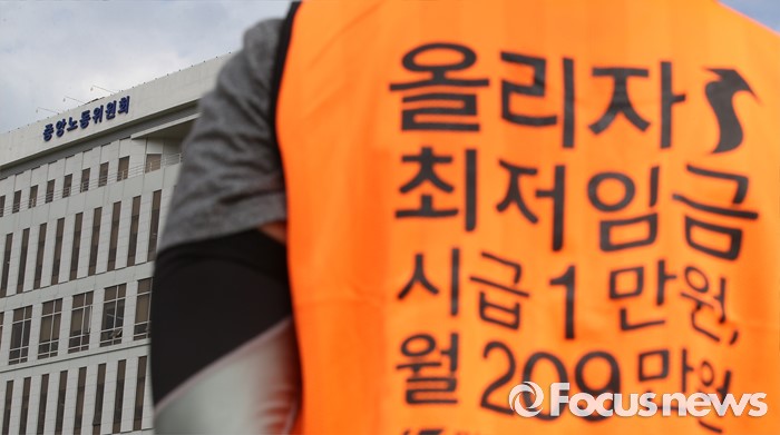(세종=포커스뉴스) 민주노총 세종충남본부 조합원들이 16일 오후 정부세종청사 고용노동부 앞에서 최저임금 1만원 쟁취 집회를 갖고 있다. 이날 최저임금위원회 4차 전체회의가 열렸다.