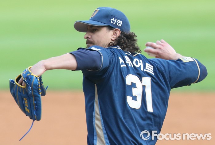 (서울=포커스뉴스) 16일 서울 잠실구장에서 열린 2016 프로야구 NC-LG 경기에서 1회말 NC 선발투수 스튜어트가 투구하고 있다.