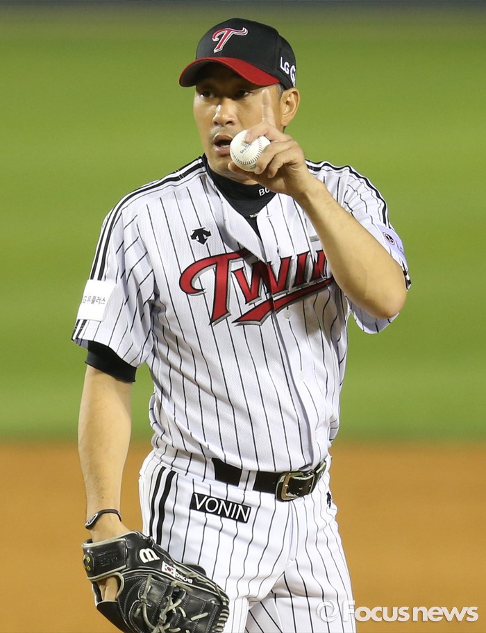 (서울=포커스뉴스) 16일 서울 잠실구장에서 열린 2016 프로야구 NC-LG 경기 7회초 2사 1,2루에서 구원 등판한 LG 봉중근이 연습 투구하며 1구 더 던진다는 사인을 보내고 있다.