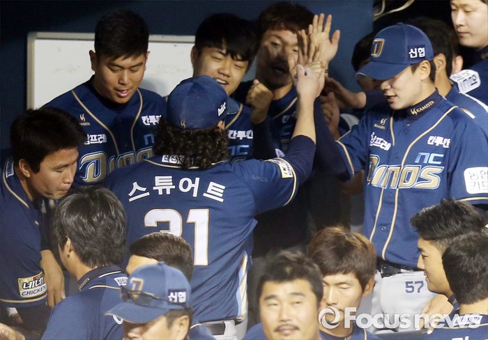 (서울=포커스뉴스) 16일 서울 잠실구장에서 열린 2016 프로야구 NC-LG 경기 8회말 2사 1루에서 교체된 NC 투수 스튜어트가 덕아웃에서 동료들의 열렬한 환영을 받고 있다.