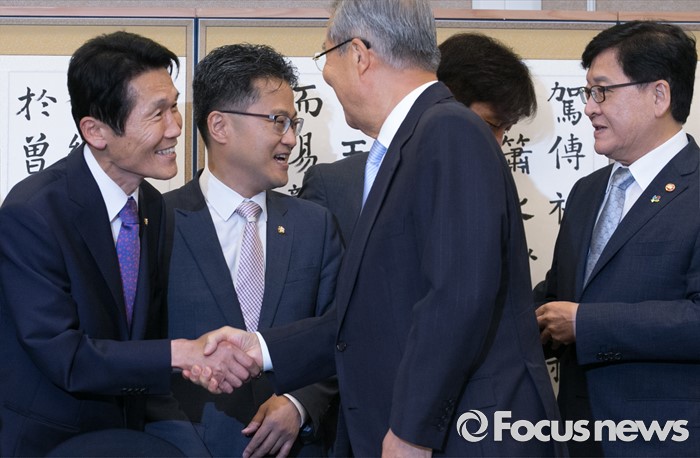 (서울=포커스뉴스) 17일 오전 서울 여의도 국회 귀빈식당에서 열린 국회 저출산극복 연구포럼 1차 회의에 참석한 김종인(왼쪽 세번째) 더불어민주당 비대위 대표와 포럼 공동대표인 윤소하(왼쪽 첫번째) 정의당 의원이 인사하고 있다. 오른쪽 첫번째는 정진엽 보건복지부 장관.