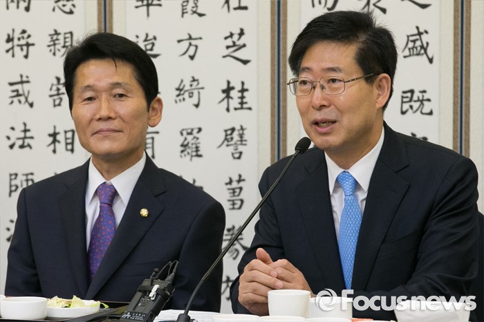 (서울=포커스뉴스) 17일 오전 서울 여의도 국회 귀빈식당에서 열린 국회 저출산극복 연구포럼 1차 회의에 참석한 포럼 공동대표인 양승조(오른쪽) 더불어민주당 의원과 윤소하 정의당 의원이 인사말을 하고 있다.