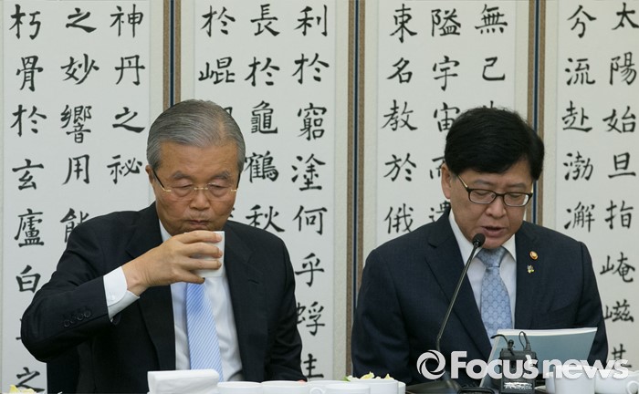 (서울=포커스뉴스) 17일 오전 서울 여의도 국회 귀빈식당에서 열린 국회 저출산극복 연구포럼 1차 회의에 참석한 김종인(왼쪽) 더불어민주당 비대위 대표가 물을 마시고 있다. 오른쪽은 정진엽 보건복지부 장관.