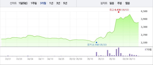 일신바이오의 주가는 5월 후반부터 가파르게 상승했다. 1달 전 주가인 5월16일(2265원)과 비교했을 때 60.4% 상승한 수치다.