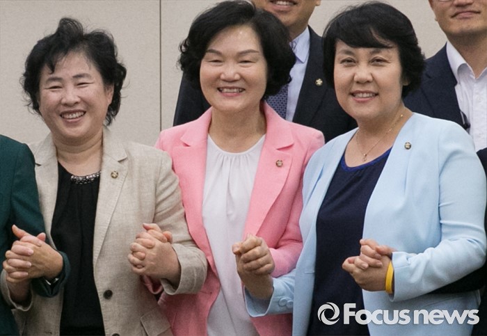 (서울=포커스뉴스) 17일 오전 서울 여의도 국회에서 여성가족위원회 전체회의를 마친 윤종필(가운데) 새누리당 간사, 정춘숙(오른쪽) 더불어민주당 간사, 신용현 국민의당 간사가 기념촬영을 하고 있다.