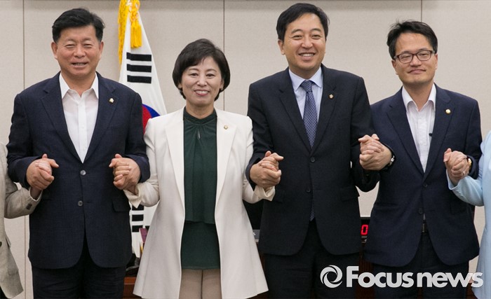 | △ 남성 위원들과 손 잡은 남인순 여성가족위원장 |