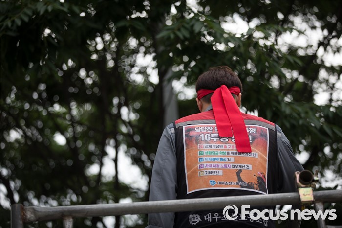 노조는 15일에 울산 본사에서 열린 조합원 중앙 집회에서 백형록 노조위원장을 비롯해 지도부 4명이 삭발을 하며 투쟁 의지를 다졌다. 현대중공업 노조는 이후 철야농성, 천막설치, 거점지역 농성, 쟁의권 확보를 통한 점거투쟁, 공장을 멈추는 옥쇄파업 등 강력한 투쟁전술을 단계적으로 구사하며, 끝장투쟁을 벌인다는 계획이다.(서울=포커스뉴스) 총파업을 결의한 대우조선해양 노조가 지난 16일 오후 서울 여의도 산업은행 앞에서 사측의 일방적 구조조정에 반대하며 상경투쟁을 벌이는 중 한 노조원의 뒷모습이 보이고 있다. 2016.06.16 김흥구 기자 (서울=포커스뉴스) 대우조선해양 노조가 지난 16일 오후 서울 여의도 산업은행 앞에서 사측의 일방적 구조조정에 반대하며 상경투쟁을 벌이고 있다. 2016.06.16 김흥구 기자