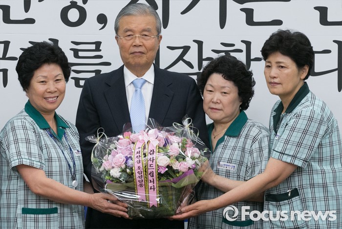 (서울=포커스뉴스) 김종인(왼쪽 두번째) 더불어민주당 비대위 대표가 17일 오전 서울 여의도 국회에서 김영숙(왼쪽 첫번째) 국회 환경미화노동조합 위원장 등 관계자들에게 직접고용 해결과 관련 꽃다발을 증정받은 뒤 포즈를 취하고 있다.
