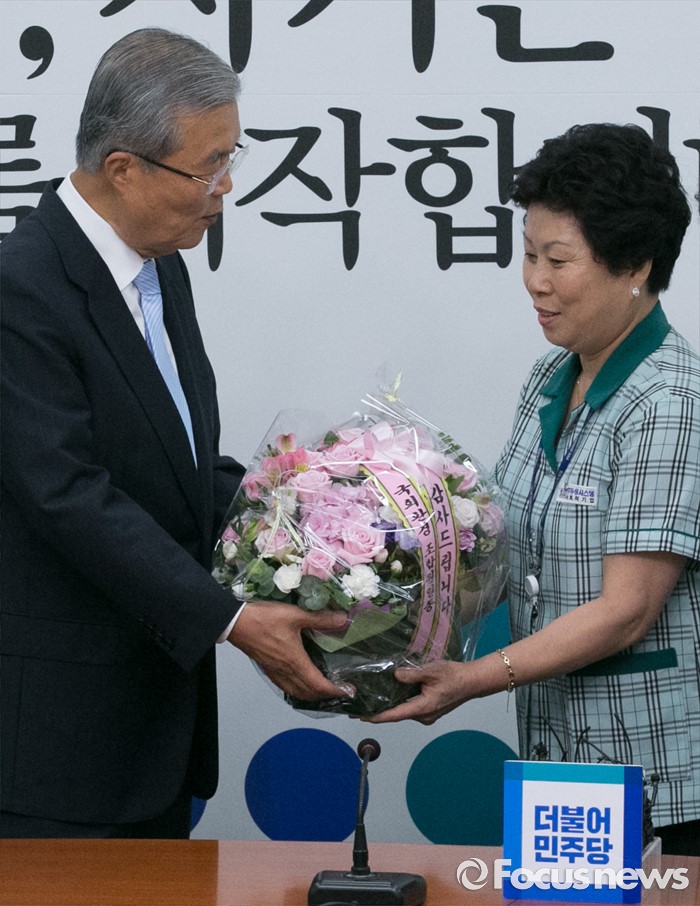 (서울=포커스뉴스) 김종인(왼쪽) 더불어민주당 비대위 대표가 17일 오전 서울 여의도 국회에서 김영숙 국회 환경미화노동조합 위원장 등 관계자들에게 직접고용 해결과 관련 꽃다발을 증정받고 있다.