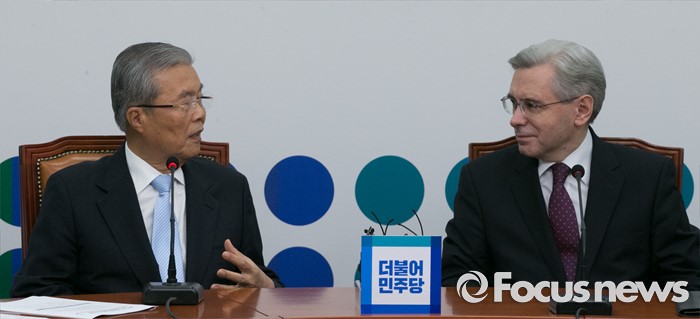 (서울=포커스뉴스) 김종인(왼쪽) 더불어민주당 비대위 대표가 17일 오전 서울 여의도 국회를 방문한 알렉산드로 티모닌 주한러시아대사와 면담을 하고 있다.